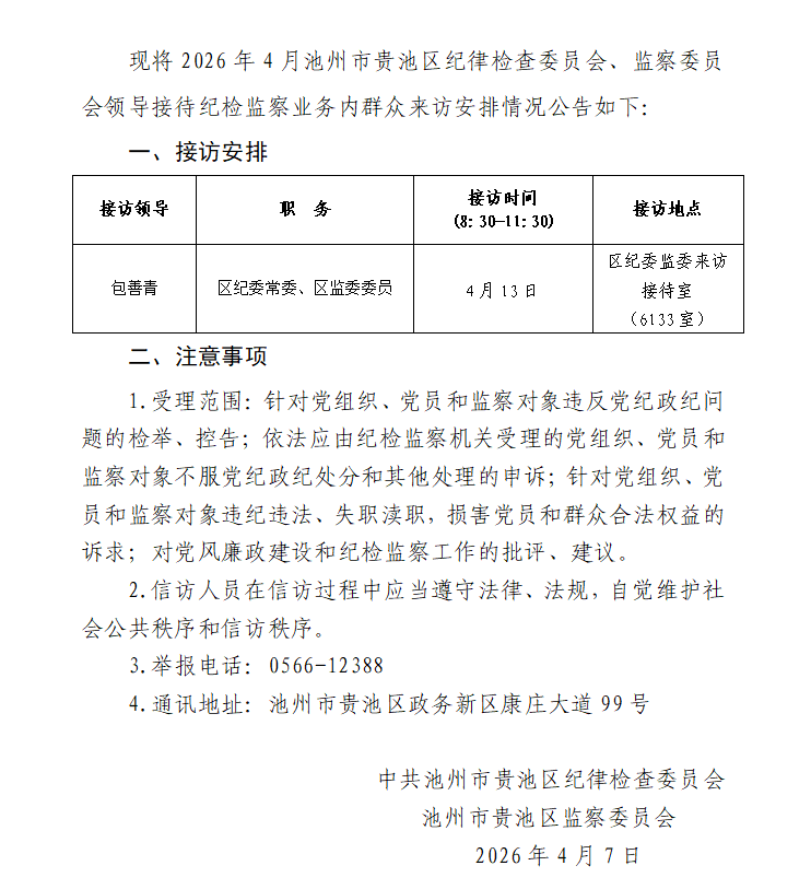 时间:2026-04-09 09:00 来源:区纪委监委信访室 分类:信访举报,通报公告,工作动态 编辑:本站编辑